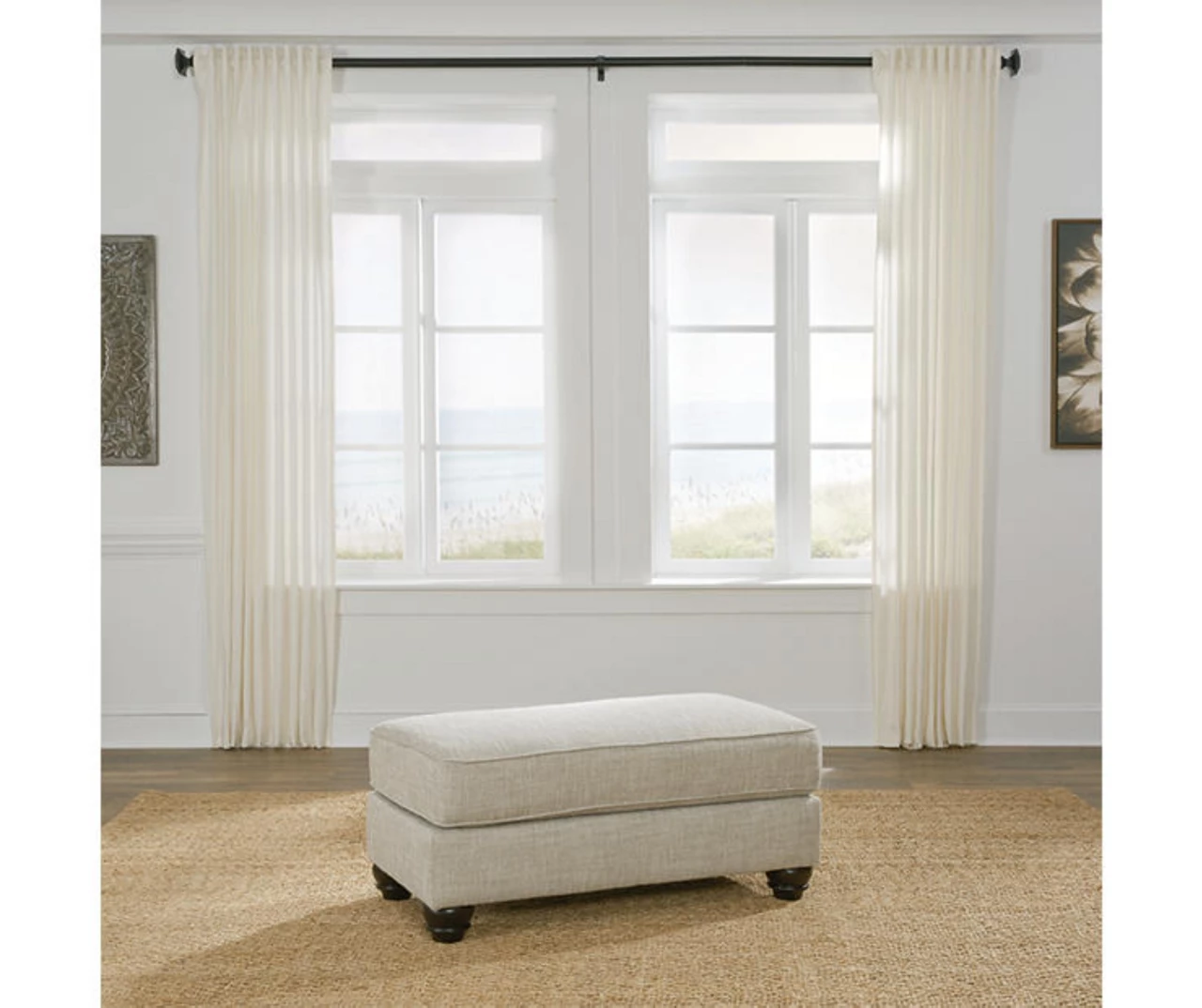 Blending comfort and style, this ottoman cradles your tired feet at the end of a long day. The distinctive look of heavily textured fabric in a light, neutral hue is enhanced by lighter flax peeking through. Either paired with another piece or used on its own, this ottoman looks and feels right at home.