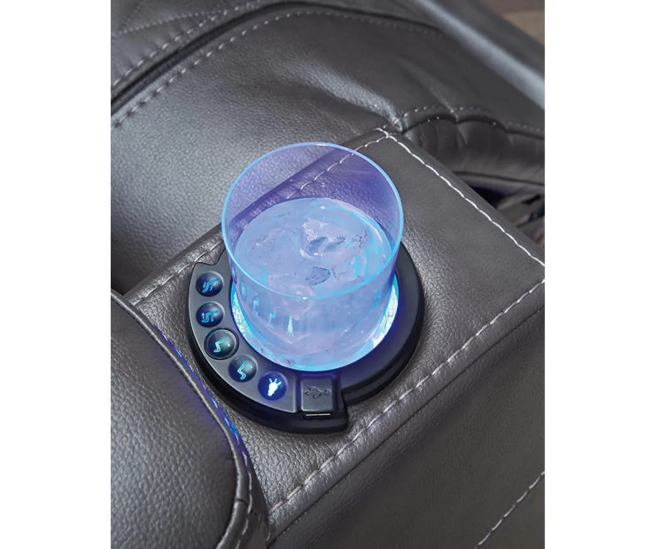 - Ambient blue LED lighting on cup holders and base for a theater-style experience