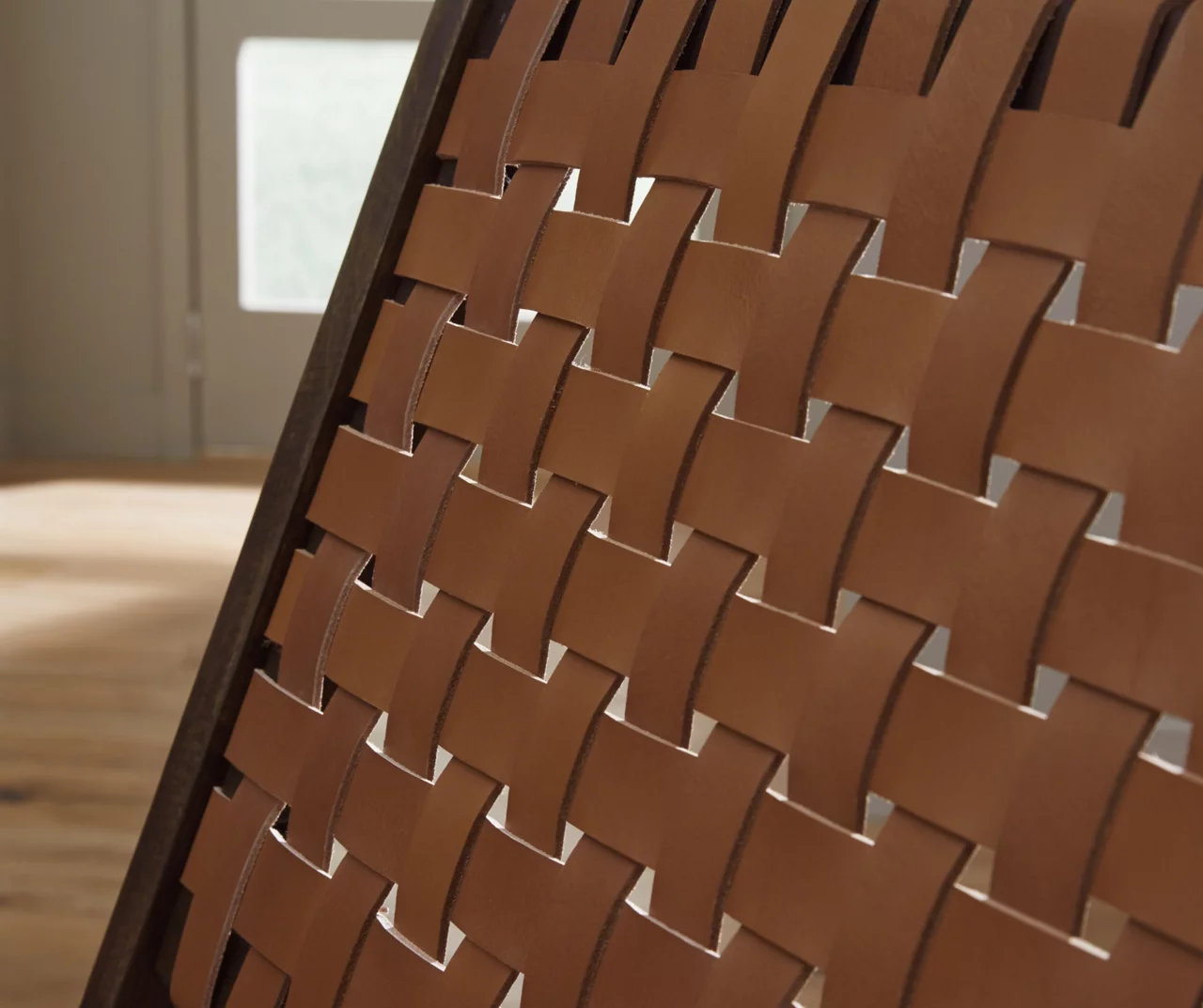 - Woven leather seat and back in a camel brown tone