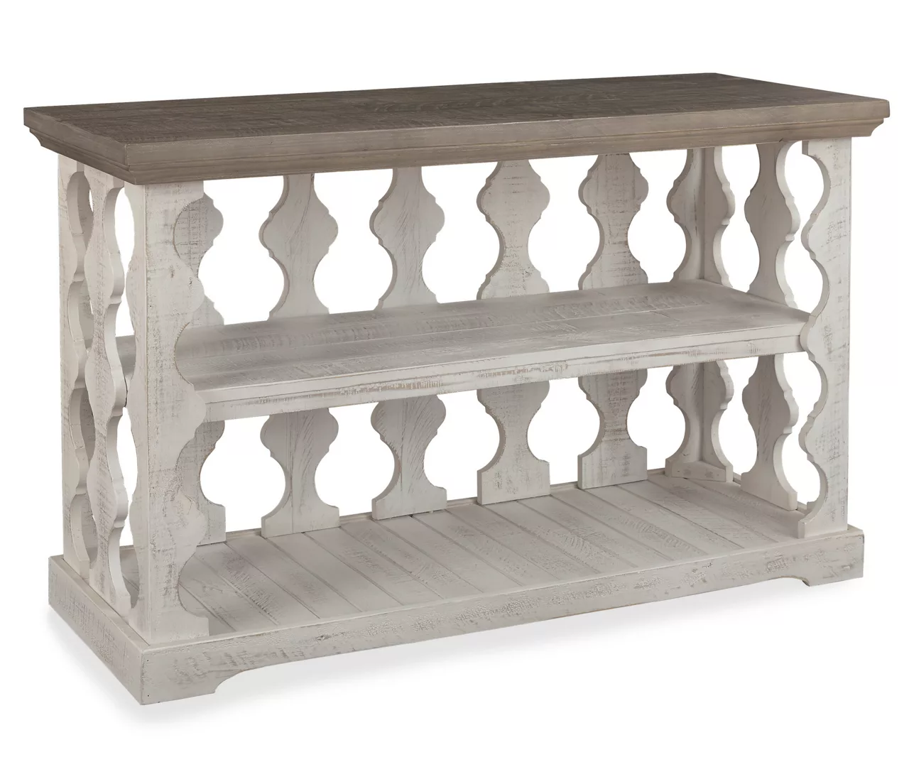 With its richly rustic finish and textural mix, this console table goes to town on modern farmhouse style. Distressed two-tone treatment blends a weathered gray with vintage white for an utterly charming effect. Balustrade-style planks supporting the top create an eye-catching look that’s anything but ordinary.