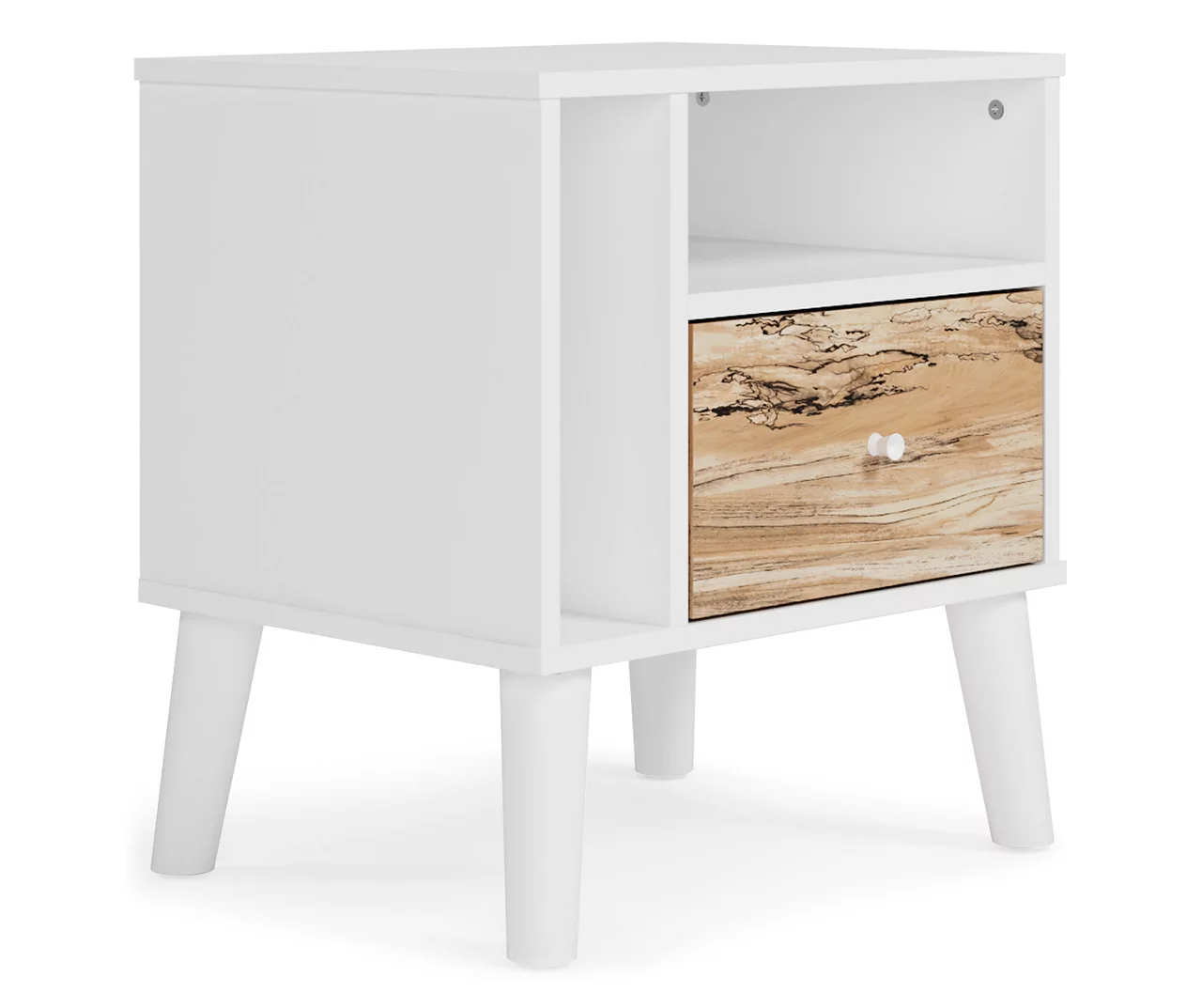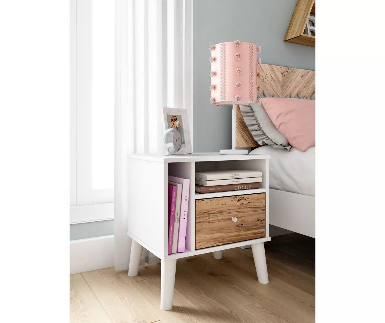- Smooth-gliding drawer and open cubbies for bedside storage