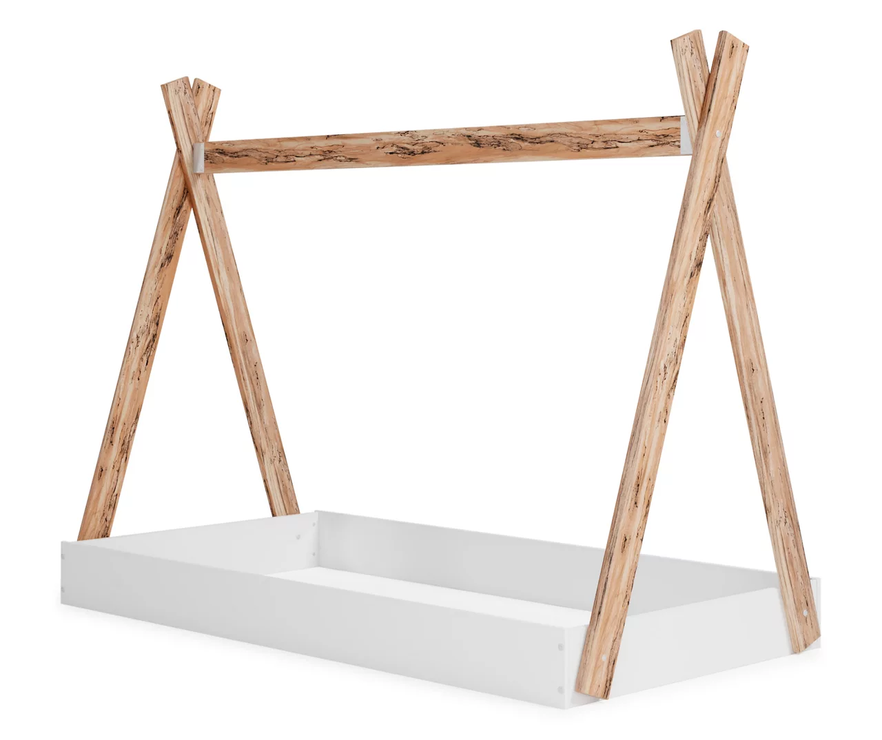 Adventure awaits with this twin tent complete bed in a box. The effortless blend of contemporary and casual styles creates an expressive two-tone look in matte white and replicated sugarberry wood grain pattern. This complete bed in a box requires no additional foundation, making it a functional, yet unique, addition to your home.